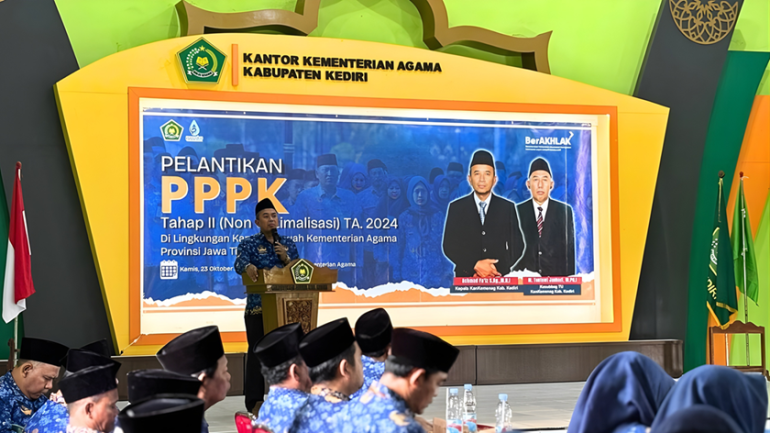 Kediri (Humas) — Sebanyak 78 Pegawai Pemerintah dengan Perjanjian Kerja (PPPK) Tahap II Non Optimalisasi Formasi Tahun 2024 di lingkungan Kantor Kementerian Agama Kabupaten Kediri resmi dilantik secara serentak oleh Menteri Agama RI, KH. Nasaruddin Umar, M.A., melalui kegiatan daring nasional pada Kamis (23/10/2025).