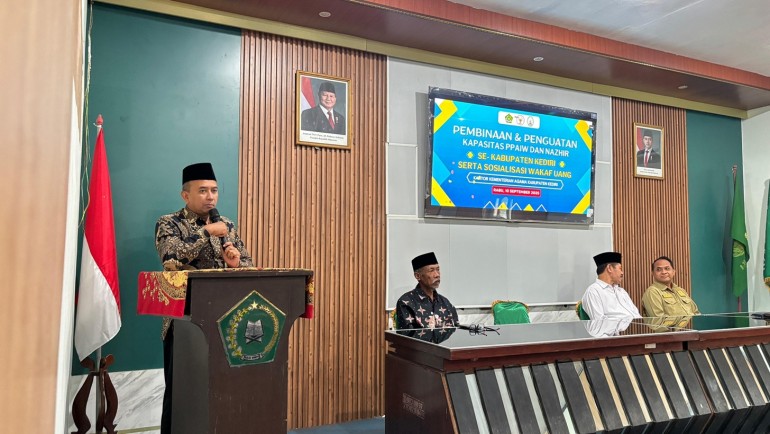 Kediri (Inmas) – 10 September 2025. Kantor Kementerian Agama Kabupaten Kediri menggelar Pembinaan dan Penguatan Kapasitas Pejabat Pembuat Akta Ikrar Wakaf (PPAIW) serta Nazhir, sekaligus Sosialisasi Wakaf Uang. Kegiatan yang diikuti 60 peserta ini melibatkan para Kepala Seksi (Kasi), penyelenggara, kepala madrasah, kepala KUA, pengawas, penyuluh, serta utusan dari Nahdlatul Ulama (NU) dan Muhammadiyah. Agenda ini menjadi bagian dari program nasional Kemenag RI untuk menggerakkan wakaf uang agar manfaatnya lebih terasa hingga ke tingkat daerah.