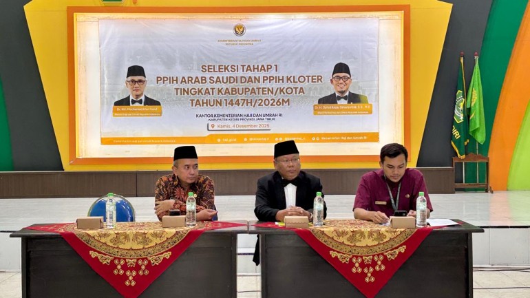 Kab. Kediri (Humas) — Kantor Kementerian Agama Kabupaten Kediri bersama Kementerian Haji dan Umroh Kabupaten Kediri menyelenggarakan Seleksi Tahap I Petugas Penyelenggara Ibadah Haji (PPIH) Arab Saudi dan PPIH Kloter Tingkat Kabupaten/Kota Tahun 1447 H / 2026 M, Kamis (4/12/2025). Kegiatan yang digelar di Aula Belakang Kankemenag Kabupaten Kediri ini diikuti oleh 65 peserta dari berbagai kecamatan.