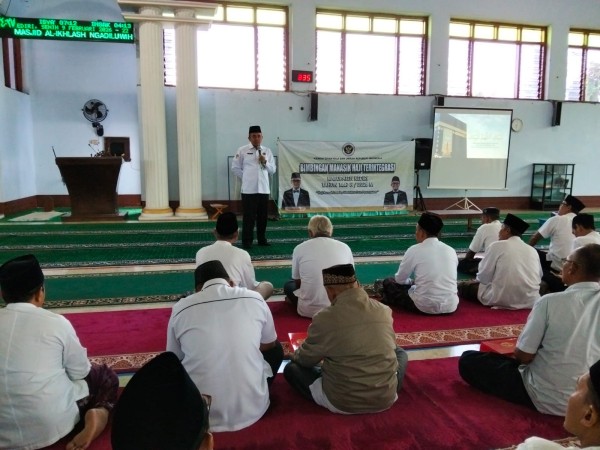 Kediri (Inmas) — Kepala Kantor Kementerian Agama Kabupaten Kediri, H. Ahmad Fa’iz, M.HI, menyampaikan materi Layanan dan Ibadah Haji di Makkah Pra Armuzna pada kegiatan manasik haji calon jemaah haji Kabupaten Kediri Kecamatan Ngadiluwih yang diselenggarakan oleh Kementerian Haji dan Umroh Kabupaten Kediri, Senin (9/2/2026), di Masjid Al-Ikhlas Ngadiluwih.