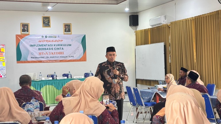 Kab. Kediri (MTsN 3) — Kepala Kantor Kementerian Agama Kabupaten Kediri, Achmad Fa’iz, mengajak seluruh unsur di madrasah untuk menjadikan setiap kesempatan berinteraksi dengan peserta didik sebagai bagian dari upaya mewujudkan generasi muda yang berkarakter, berakhlak, dan bermanfaat bagi bangsa serta negara. Ajakan tersebut disampaikan saat memberikan arahan pada kegiatan Workshop Implementasi Kurikulum Berbasis Cinta (KBC) di MTsN 3 Kediri, Kamis (23/10/2025).