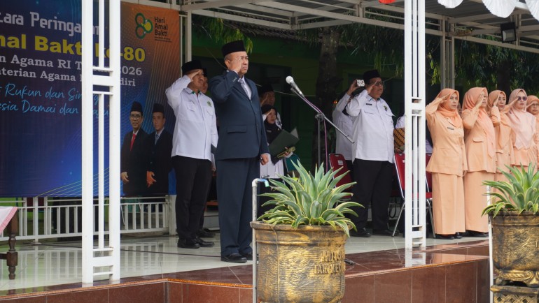 Kab. Kediri (Humas) — Kantor Kementerian Agama Kabupaten Kediri menggelar Upacara Peringatan Hari Amal Bakti (HAB) ke-80 Kementerian Agama Tahun 2026 di Lapangan MTsN 4 Kediri, Sabtu pagi, 3 Januari 2026, pukul 07.00 WIB. Upacara ini menjadi momentum meneguhkan tema “Umat Rukun dan Sinergi, Indonesia Damai dan Maju” sebagai landasan pengabdian Kementerian Agama dalam menjaga keharmonisan kehidupan beragama.